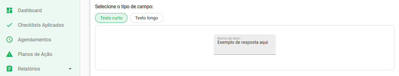 Na criação ou edição de itens, você precisa definir qual o tipo de resposta ele terá. Isso ajudará a definir que tipo de informação é esperada para cada pergunta de seu checklist.