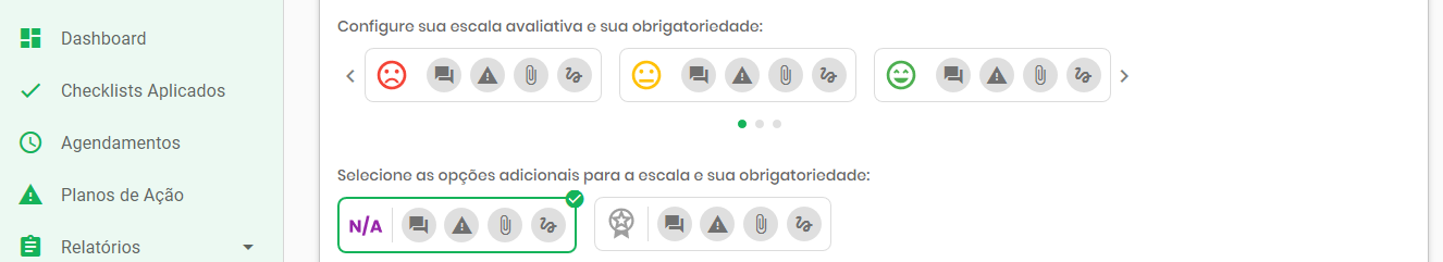 O tipo avaliativo disponibiliza três possibilidades de opções de resposta: Sim ou Não, as carinhas avaliativas, além das opções de escala de respostas adicionais (N/A e Superou).