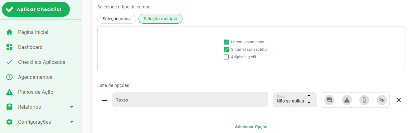 O tipo lista de seleção permite criar uma lista de opções clicando em adicionar opção. É possível ordenar e personalizar a opção de resposta, além de definir se o item é de seleção única ou seleção múltipla.