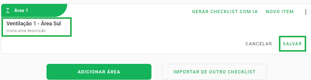 Passo 1: Para começar a criar o seu checklist, clique em Adicionar área (1). Depois, escolha um nome para esta área, uma descrição (opcional) e clique em Salvar.