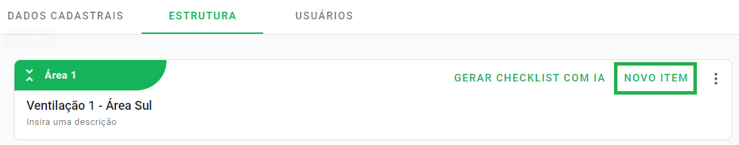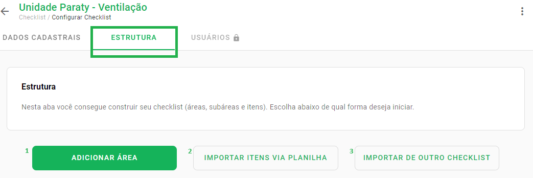 A próxima aba é a de Estrutura, na qual você vai literalmente montar o seu checklist com perguntas e complementos que você desejar.