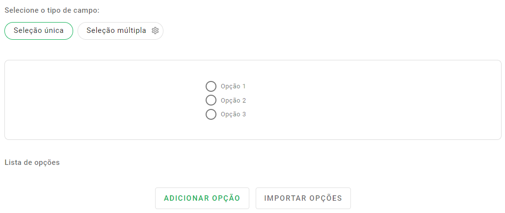Lista de seleção: o tipo lista de seleção permite que você crie uma lista de opções que podem ser selecionadas no momento da avaliação. É possível definir se o aplicador poderá selecionar uma (seleção única) ou várias (seleção múltipla) opções.