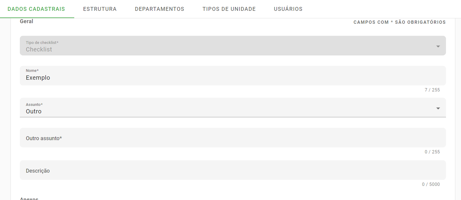 Aqui você irá nomear o seu checklist, selecionar um Assunto da lista suspensa ou clicar em Outro Assunto e criar uma descrição, caso sinta necessidade. Além disso, é possível incluir um anexo que seja útil no momento da aplicação.