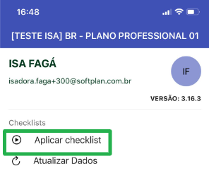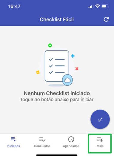➕ Dica: Uma outra forma de iniciar a aplicação de um checklist é clicando no Mais no menu inferior da tela do aplicativo.Na página que se abrirá, clique em Aplicar checklist, como mostrado a seguir: