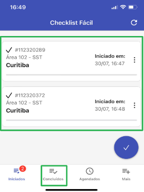 Os checklists finalizados ficam disponíveis na aba Concluídos, localizada no menu inferior do aplicativo.