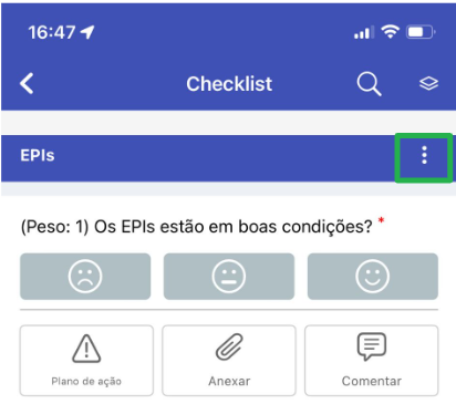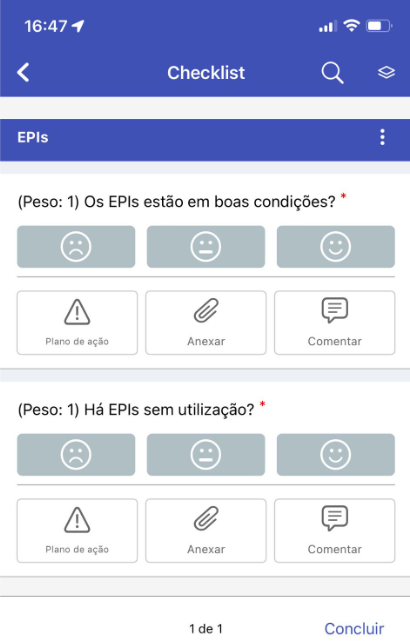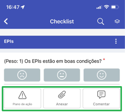 Desta forma, pode ser que você precise adicionar um comentário sobre aquele item específico ou, caso tenha sido detectada alguma não conformidade, pode ser solicitado um plano de ação para resolver o problema em questão. Além disso, pode ser solicitado o envio de um anexo (uma foto, vídeo ou um arquivo).