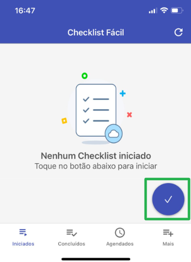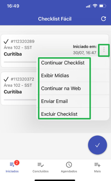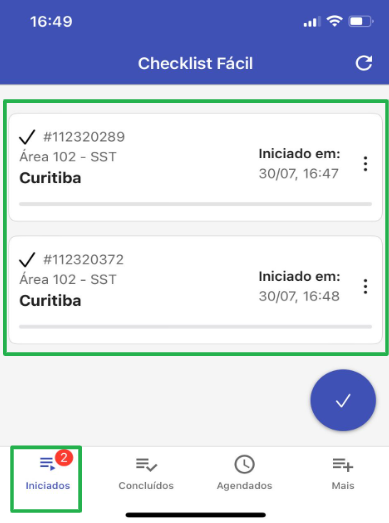 Para visualizar os checklists que já foram iniciados, mas ainda não foram concluídos, vá até o menu inferior do aplicativo e clique em Iniciados. Aparecerá uma listagem, como mostrada na imagem a seguir: