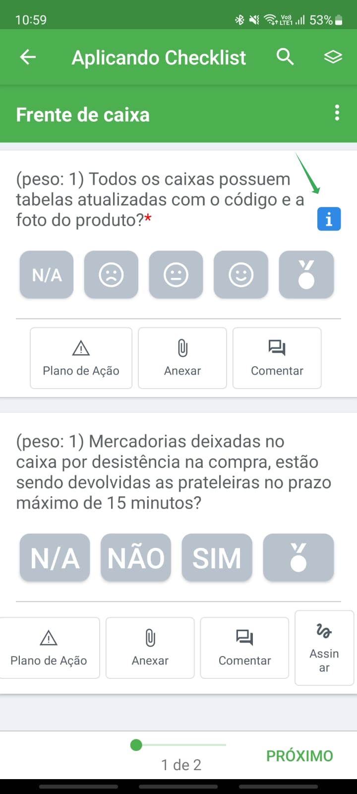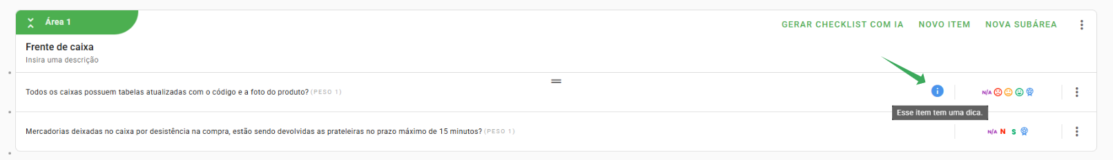 Itens que possuem dicas são sinalizados na estrutura do checklist através do ícone "i":