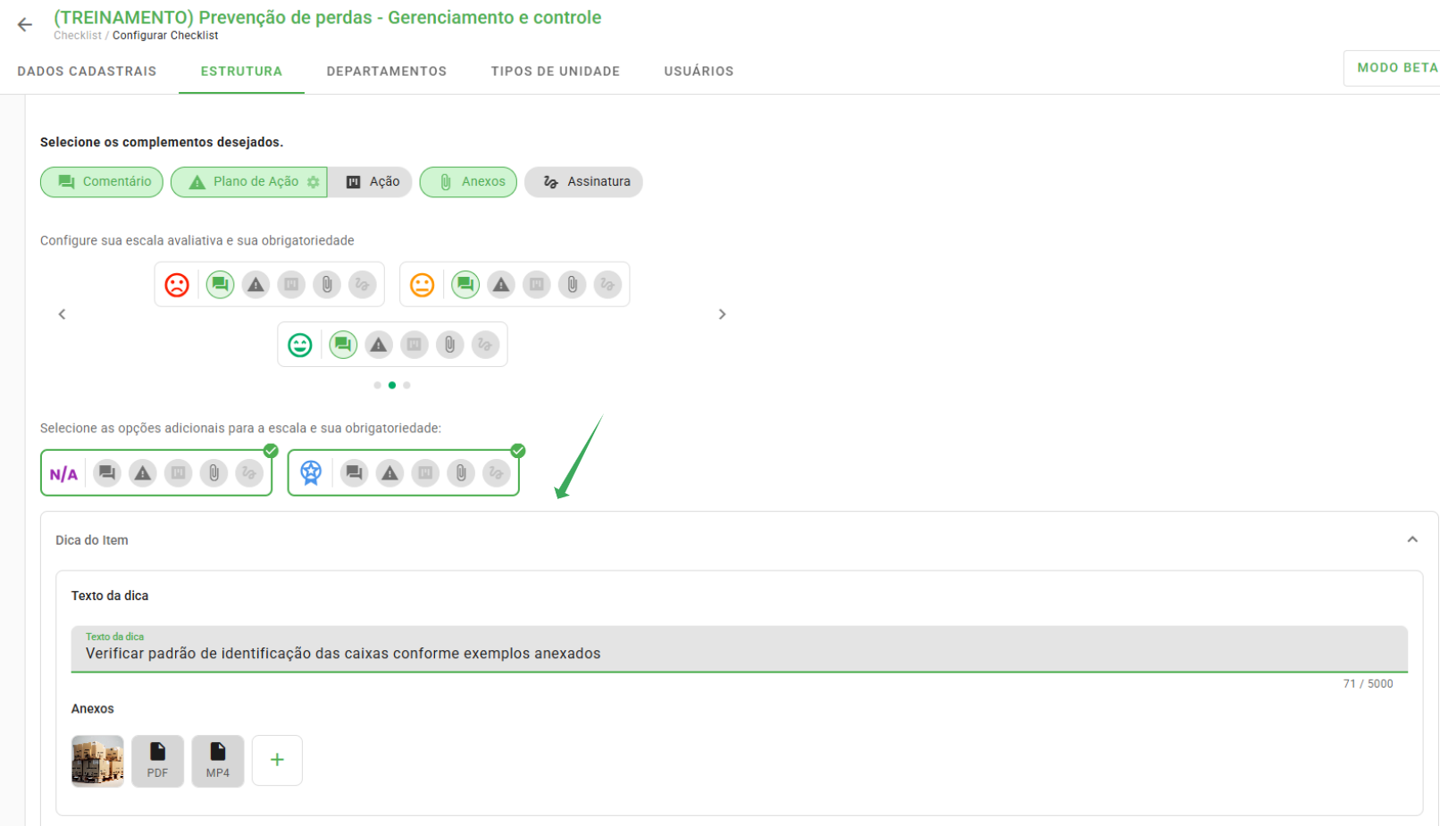 A opção de inserir a dica está disponível ao criar um novo item ou ao editar um já existente, em Configurações > Checklists > Estrutura.