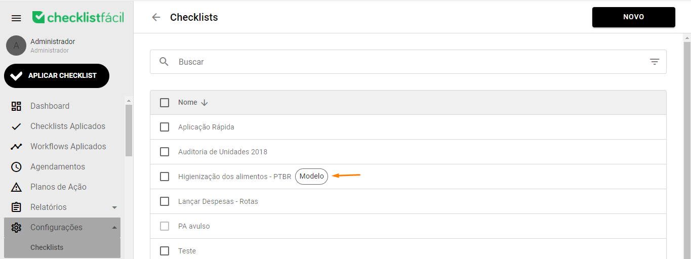 Caso nenhum checklist tenha sido configurado como modelo, a tag não será exibida na listagem. Lembre-se que é possível alterar qual checklist será o modelo sempre que necessário, seguindo o mesmo procedimento de configuração.