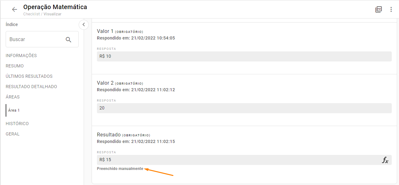 O sistema também sinalizará caso o resultado da conta tenha sido inserido manualmente pelo usuário aplicador, exibindo a etiqueta "Preenchido manualmente".