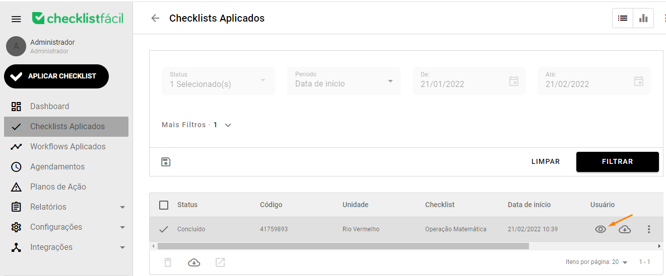 Para conferir a operação matemática nos relatórios, localize a avaliação desejada no menu Checklists Aplicados e clique na opção Visualizar avaliação.