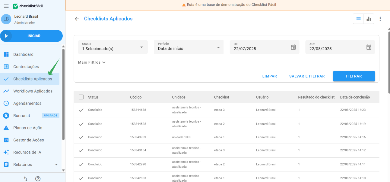 Passo 1 - No sistema web, acesse Checklists Aplicados.