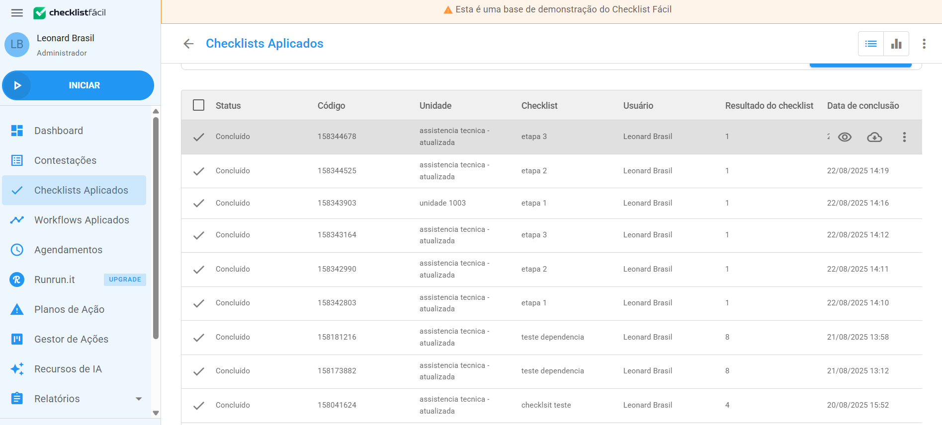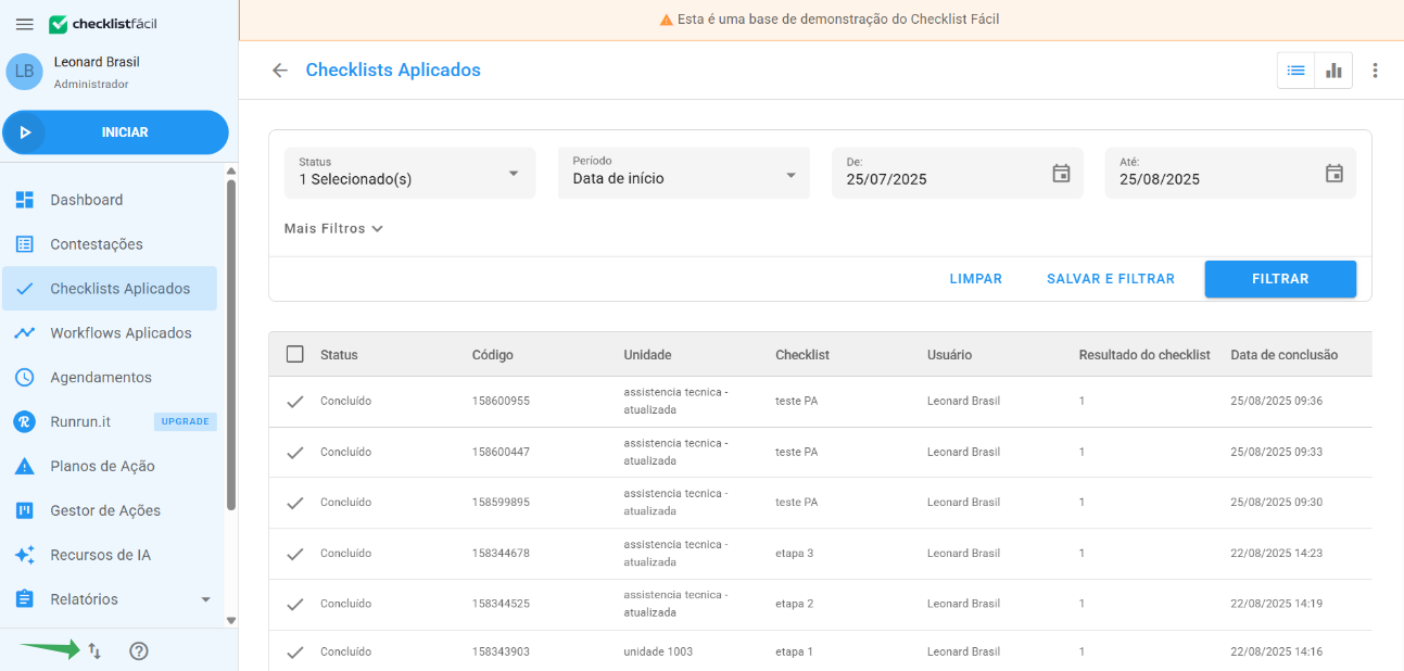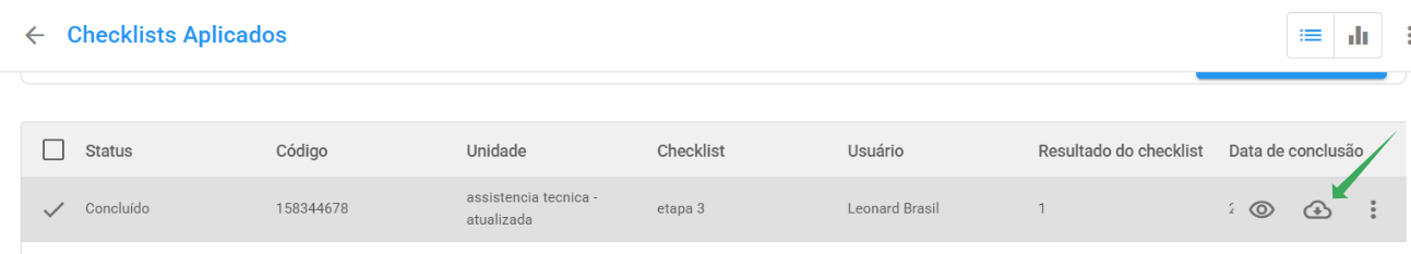 Após aplicar um checklist, é possível visualizar os resultados diretamente na web ou exportá-los em formato PDF.