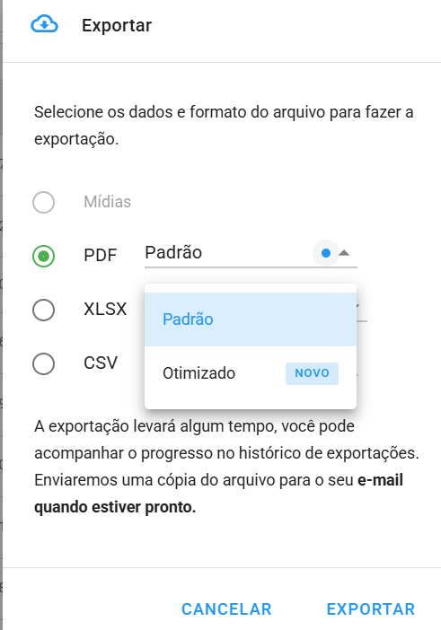 Essa função facilita o compartilhamento das informações, seja em uma versão completa ou em um relatório mais enxuto.