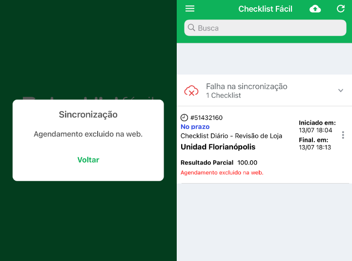 Pode ocorrer de um agendamento ser cancelado por um administrador ou gestor da sua empresa. Quando isso acontece, você poderá encontrar as seguintes mensagens de alerta no seu aplicativo Checklist Fácil.