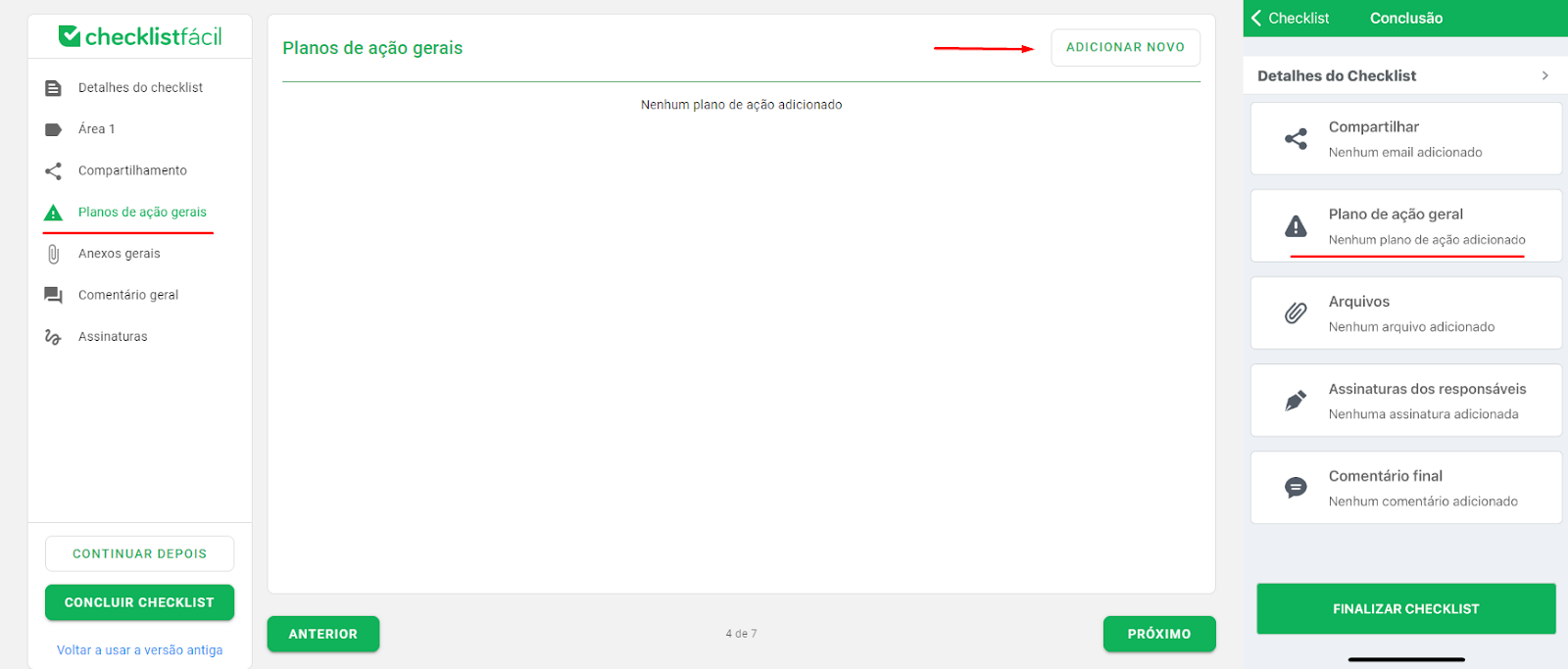 O plano de ação geral fica disponível na tela de conclusão do checklist no aplicativo. Na versão web, ele pode ser acessado pelo índice.