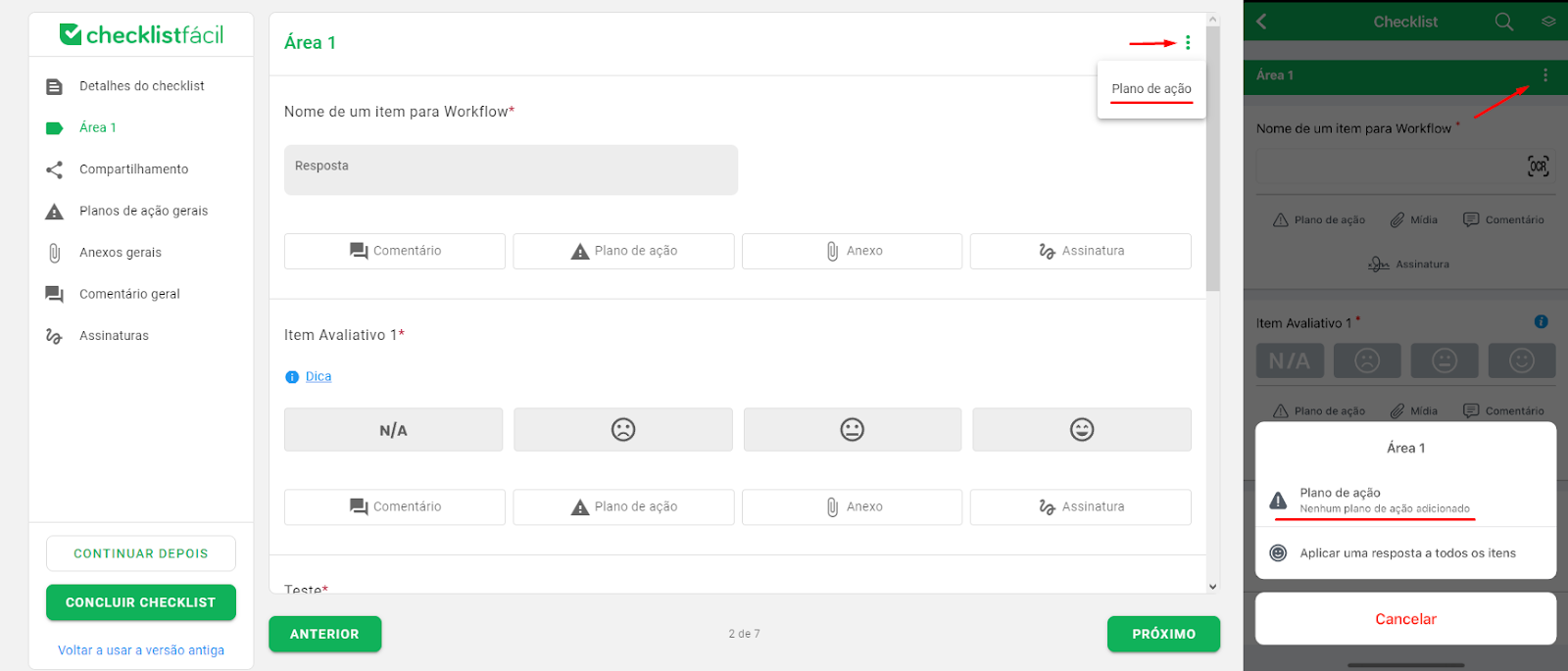 Em alguns casos, o preenchimento do plano de ação pode ser obrigatório. Isso depende da resposta selecionada em um item ou das regras definidas por gestores e administradores da sua empresa no Checklist Fácil.