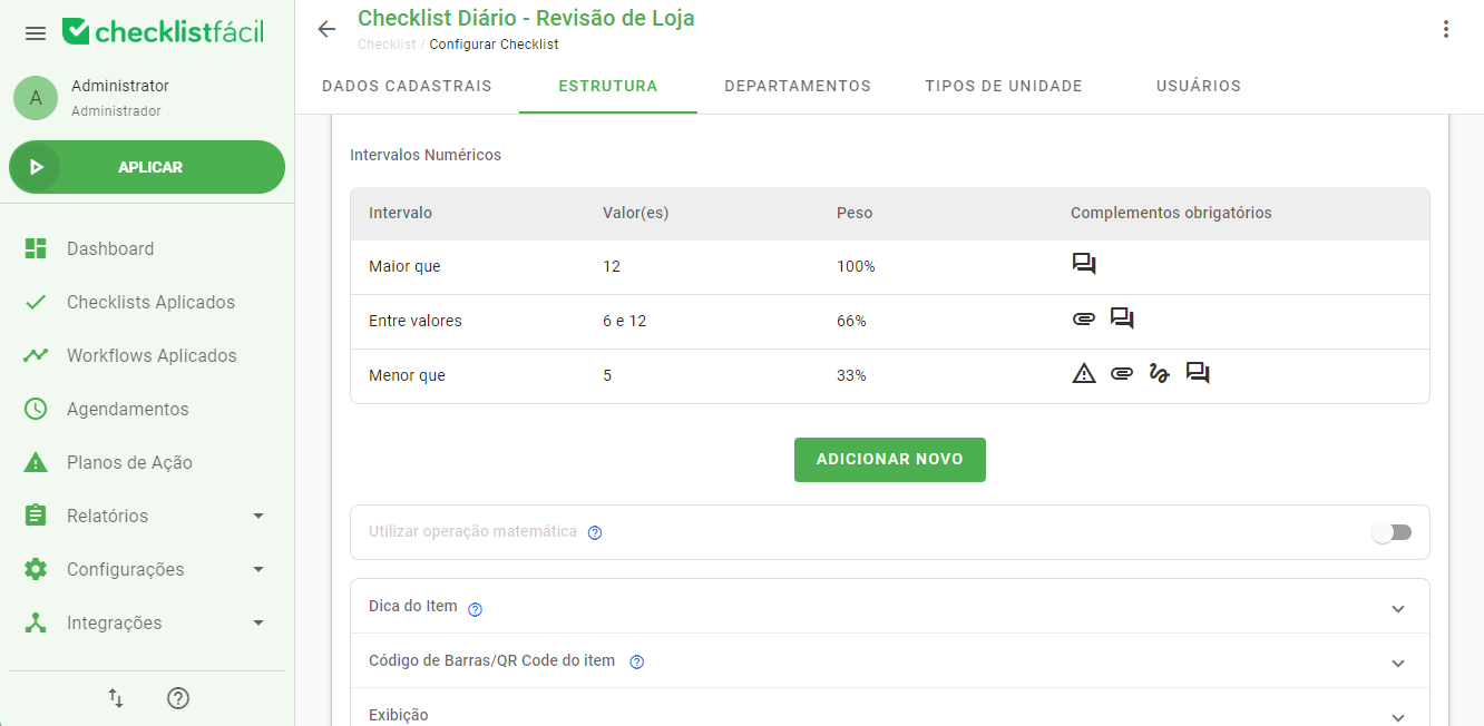 Os intervalos possibilitam que você implemente sua regra de negócio quanto aos itens numéricos e faça com que eles participem do cálculo da nota do checklist, por meio do peso.