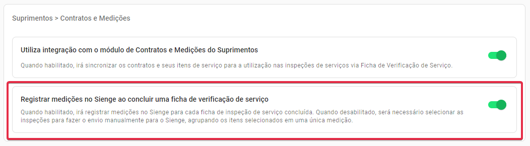 → Com a opção ativada: Cada inspeção concluída gera automaticamente uma medição no Sienge.