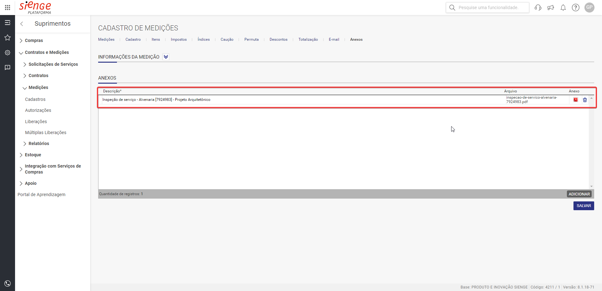 Suprimentos > Contratos e Medições > Medições > Cadastros