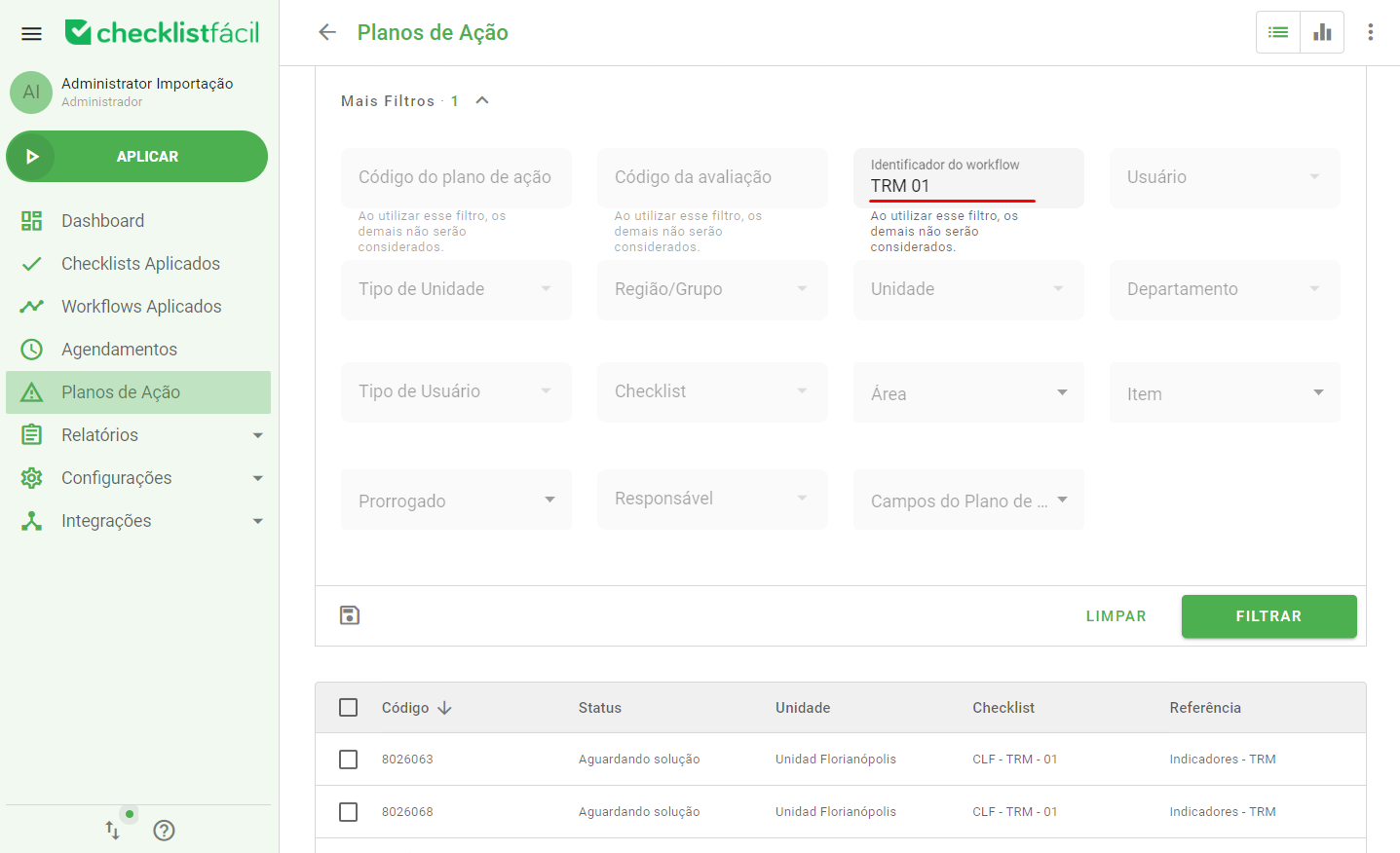 Agora é possível filtrar os Planos de Ação utilizando o Identificador Único de um Workflow. Esta funcionalidade permite localizar, de forma centralizada e rápida, todos os planos que estão vinculados a um fluxo de trabalho específico.