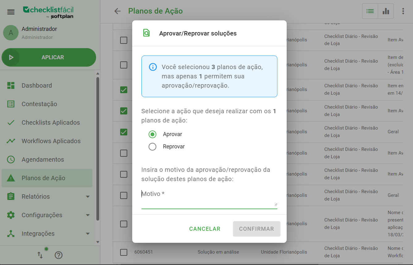 Para agilizar a gestão dos planos de ação, o Checklist Fácil permite aprovar ou reprovar soluções pendentes em massa. Essa funcionalidade é ideal para otimizar o tempo do gestor que lida com um grande volume de demandas simultâneas.
