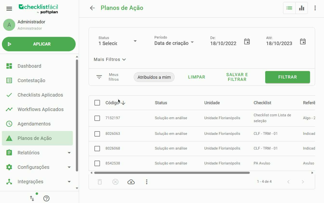 Utilize os filtros da tela de Planos de Ação para selecionar exatamente as soluções que deseja aprovar antes de abrir o menu de ferramentas.