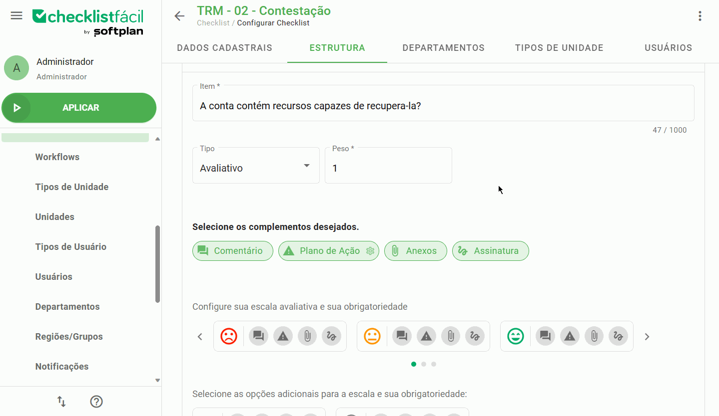 Para que um item possa ser contestado, é necessário realizar alguns ajustes nas configurações do modelo de checklist e garantir as permissões corretas para os usuários envolvidos.