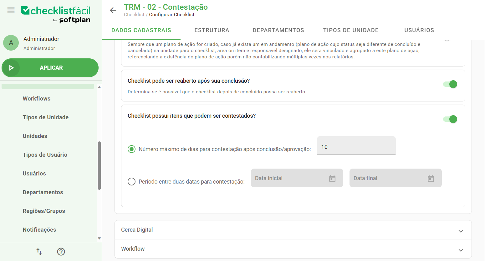 Nesta mesma tela, defina o período de contestação. Ele pode ser uma quantidade de dias fixos após a conclusão do checklist ou um período personalizado.