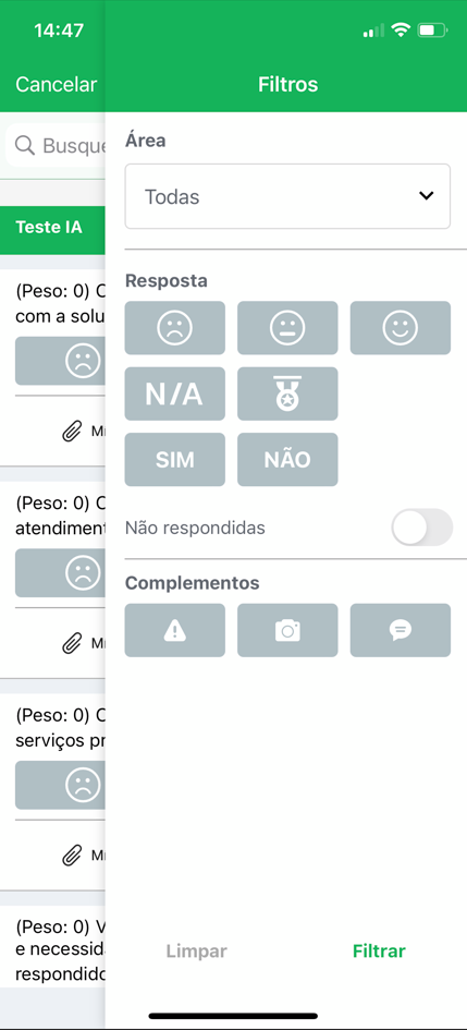 No entanto, depois de clicar na lupa, você tem a opção de filtrar pela área, resposta, complementos ou por itens ainda não respondidos.