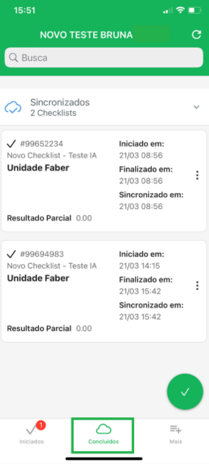 Para visualizar os checklists que já foram finalizados, vá até o menu inferior do aplicativo e clique no ícone de Concluídos: