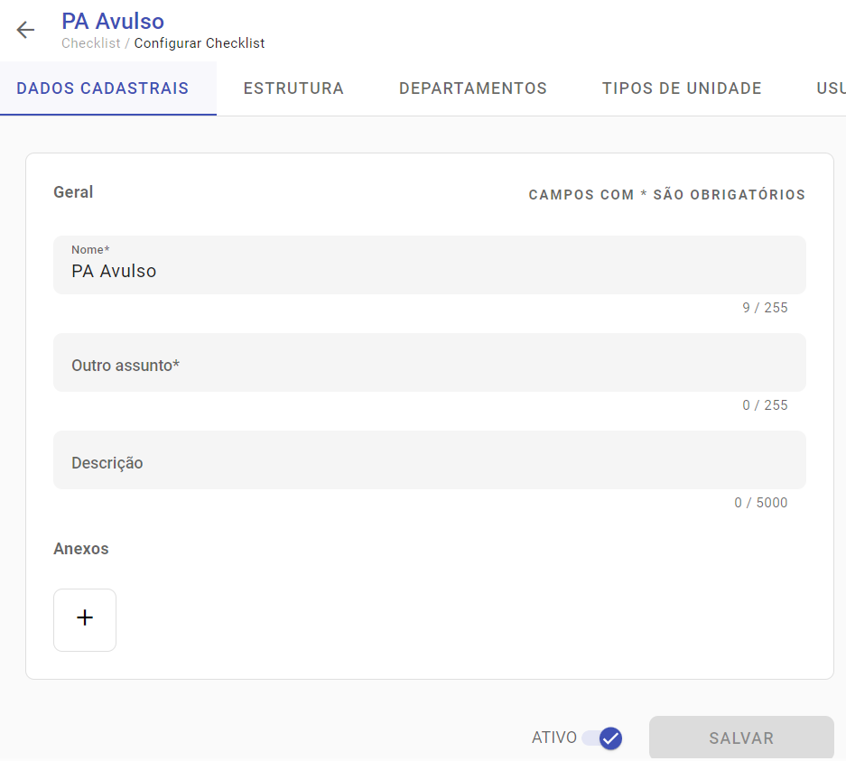 Atenção: Após a ativação do módulo, ele só estará disponível para uso após você realizar a configuração do checklist de "PA Avulso", acessando a edição dele para definir a estrutura e os vínculos necessários, antes disso ele permanece inativo.