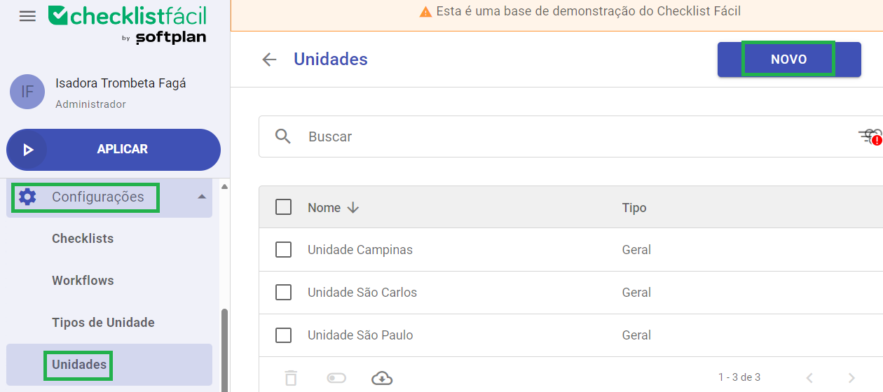 - Na listagem de unidades, clique em Novo, no canto superior direito da tela.