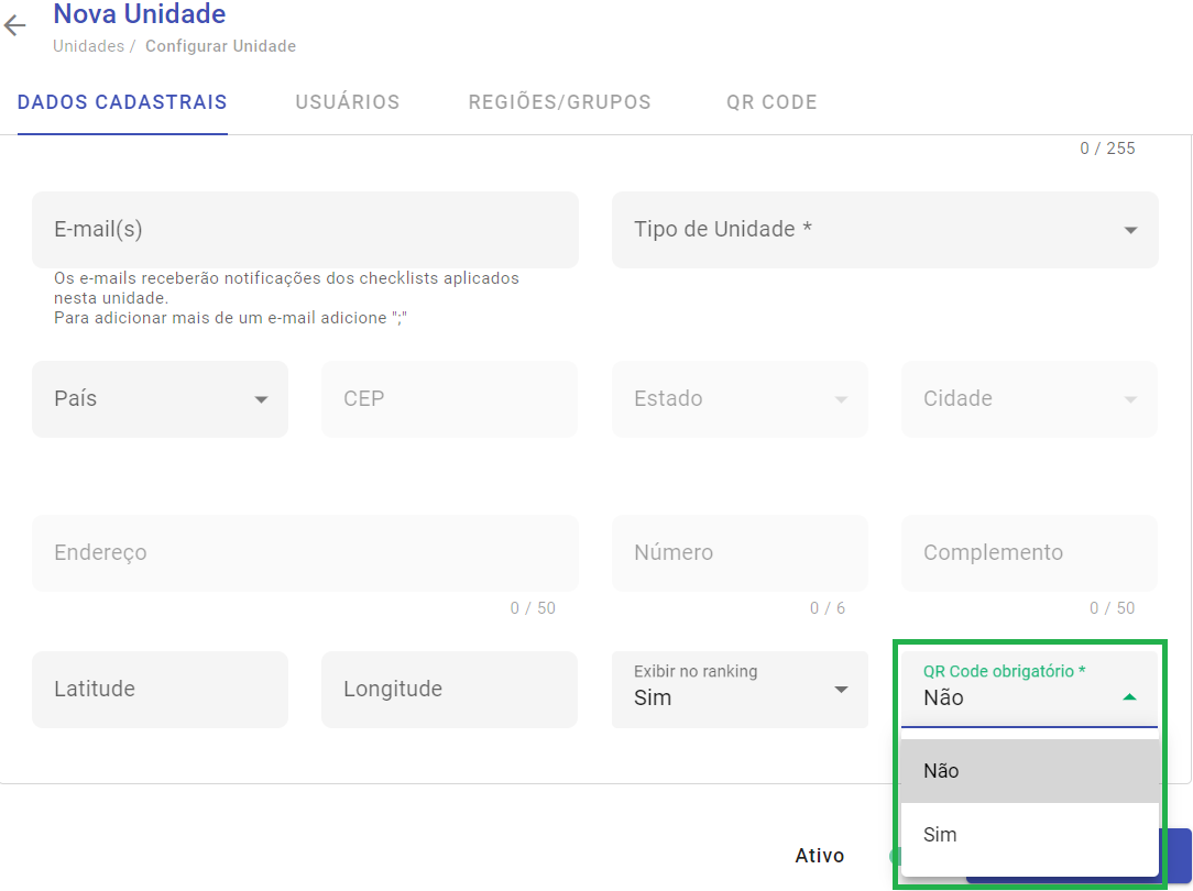 - Ainda nessa aba, é possível habilitar o campo “QR Code obrigatório”, determinando se a aplicação do checklist só poderá ser feita via leitura do código.