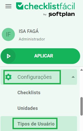 Passo 1: Acesse a aba Configurações e Tipos de Usuário, no menu lateral esquerdo do sistema: