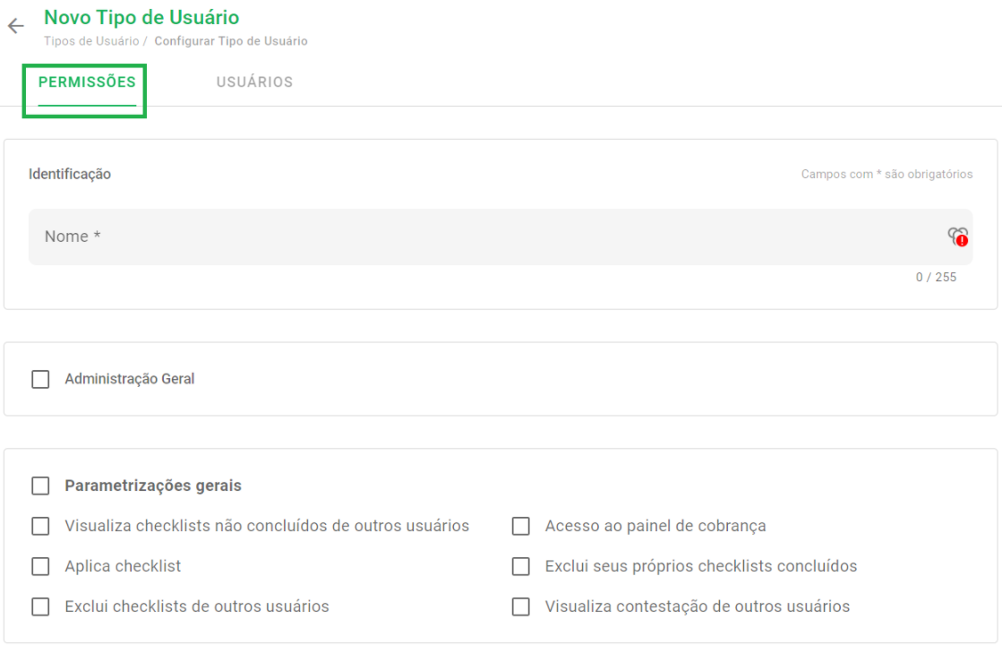 Passo 3: A tela de novo tipo de usuário contém duas abas - Permissões e Usuários.