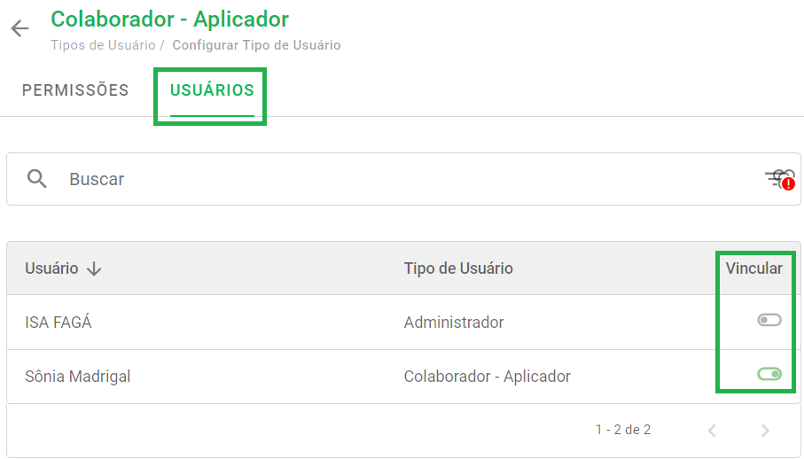 Com um tipo de usuário criado e suas permissões já selecionadas, é hora de vinculá-lo a um usuário. Para fazer esse vínculo, clique na aba Usuários, como na imagem abaixo: