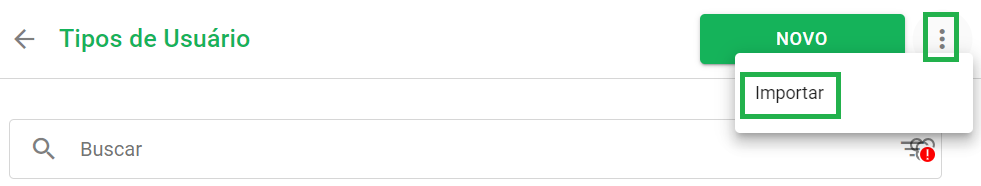 Ao acessar a tela de adicionar tipos de usuários, clique nos três pontinhos e, depois, em Importar: