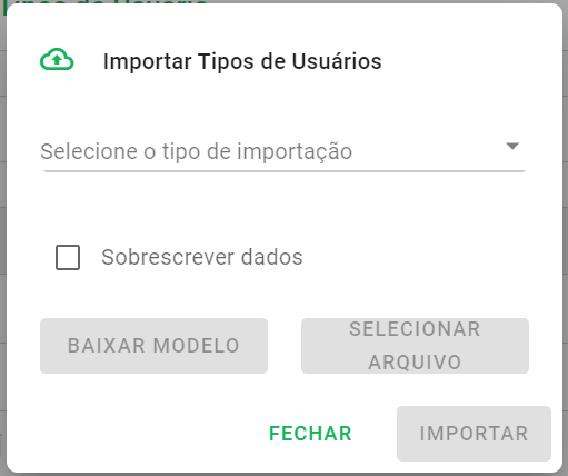 Caso você já tenha uma planilha com tipos de usuários ou se você deseja criar vários tipos de uma única vez, é possível fazer uma importação.