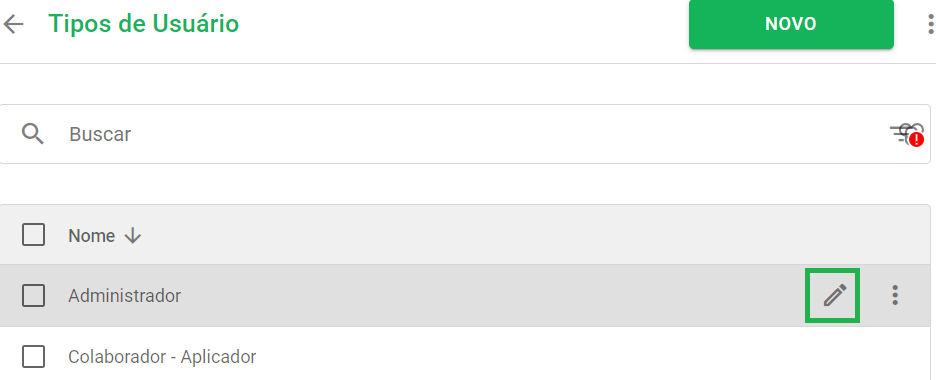 Caso você queira acrescentar ou retirar alguma permissão de um tipo de usuário, é só ir até a tela de adicionar tipos de usuários, passar o cursor do mouse sobre o nome que deseja alterar e clicar em Editar no ícone destacado na imagem a seguir: