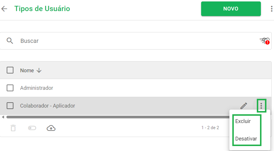 Ao lado da opção de editar, é possível excluir ou desativar um tipo de usuário, clicando nos três pontinhos e selecionando a opção que desejar: