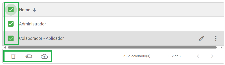 Caso você queira excluir, desativar ou exportar vários tipos de usuário de uma única vez, selecione as caixas correspondentes e aplique as ações em massa que ficam disponíveis no rodapé da página: