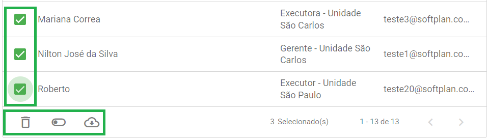 Caso você queira excluir, desativar ou exportar vários usuários de uma única vez, selecione as caixas correspondentes a eles e aplique as ações em massa que ficam disponíveis no rodapé da página:
