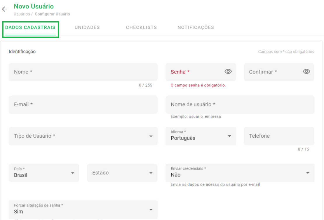 Passo 3: A tela de novo usuário contém quatro abas: Dados cadastrais, Unidades, Checklists e Notificações.