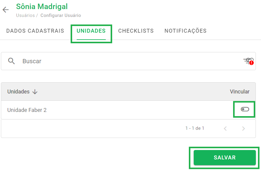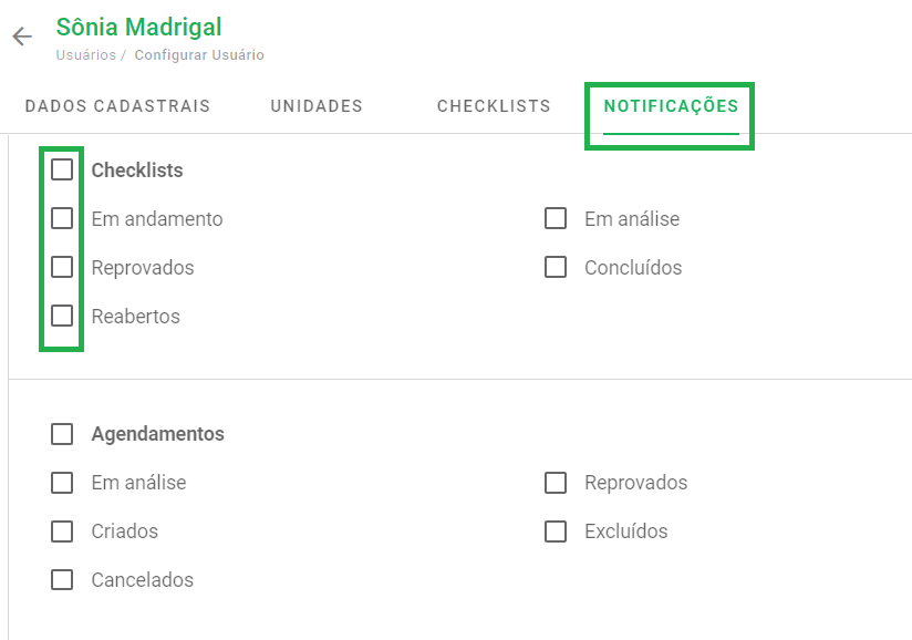 Da mesma forma, é possível ativar ou desativar o vínculo deste usuário com unidades e checklists nas abas correspondentes, além de alterar as notificações.