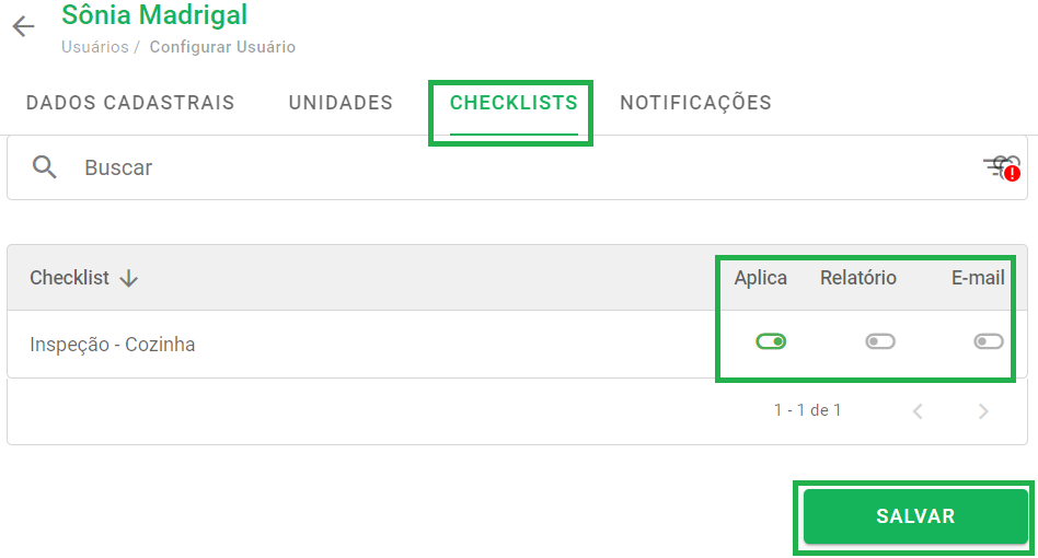 O processo é bem parecido com os descritos anteriormente: clique na aba Checklist e defina se o usuário poderá aplicar, visualizar relatórios e/ou receber e-mails relacionados a cada checklist que ele estiver envolvido. Depois, é só salvar.