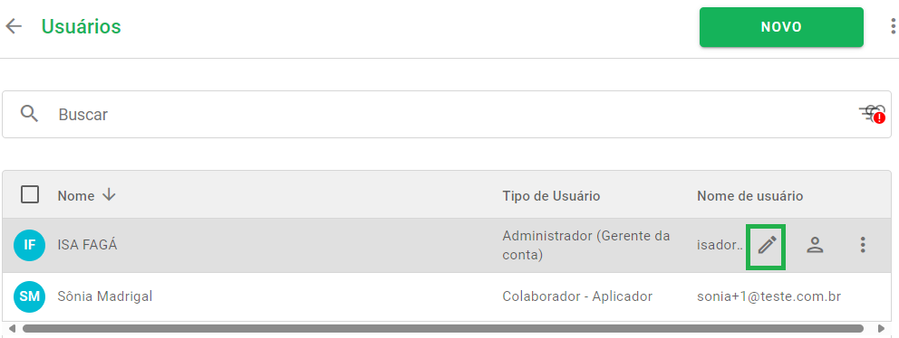 Caso você precise acrescentar ou mudar alguma informação referente a um usuário, é só ir até a tela de adicionar usuários, passar o cursor do mouse em cima do nome que deseja alterar e clicar em Editar no ícone destacado na imagem a seguir:
