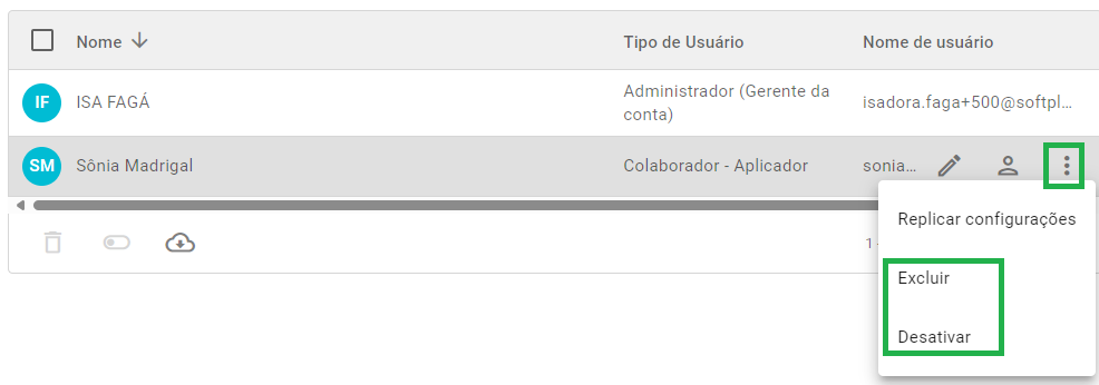 Ao lado da opção de editar, é possível excluir ou desativar um usuário, clicando nos três pontinhos e selecionando a opção que desejar: