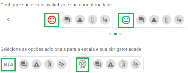 - Tipo Avaliativo: Respostas como Sim/Não, carinhas ou escala (incluindo N/A e Medalha). Permite definir peso.